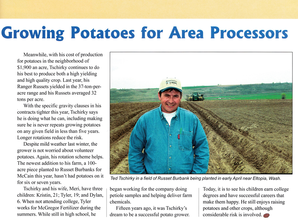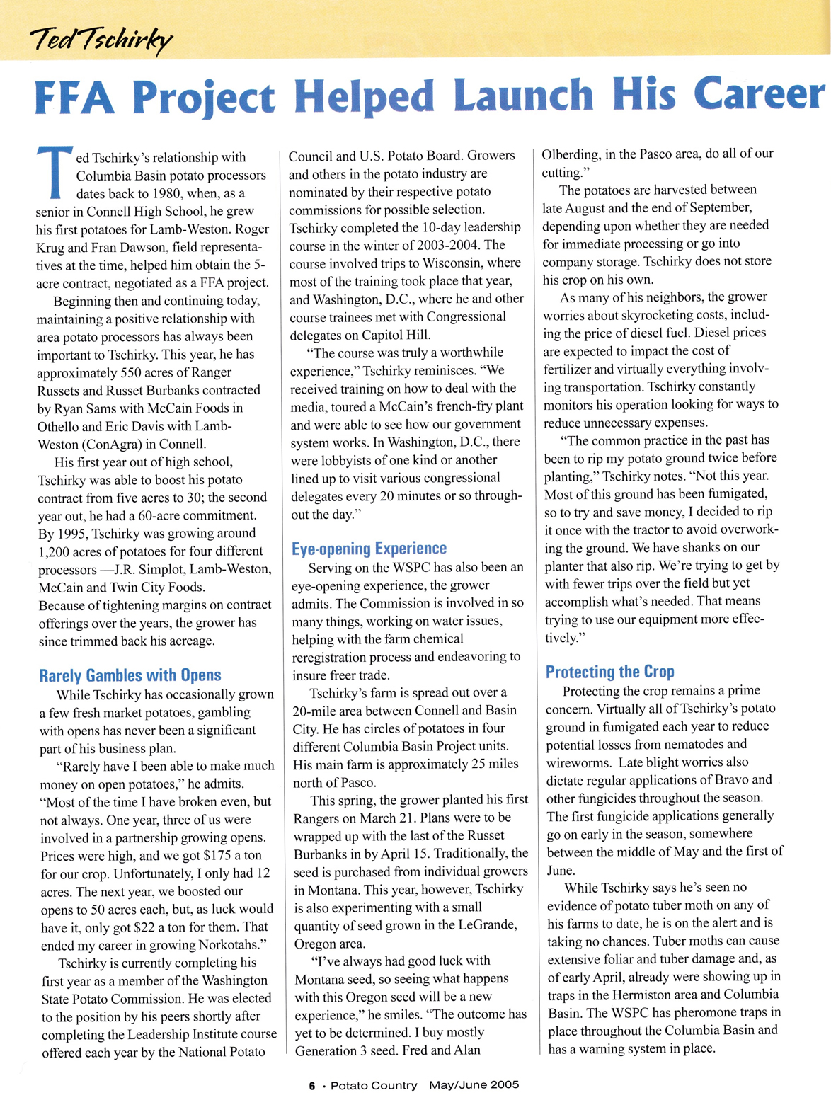 In May of 2005 the Huffinton Post was launched and Star Wars: Episode III was released in theaters. On the Cover of Potato Country magazine we had Ted Tschirky. Ted began his career as a potato grower as part of the FAA program and continues to grow in the Columbia river basin to this day. The FAA program (Future Farmers of America) is an intracurricular student organization for those interested in agriculture and leadership. It is one of the three components of agricultural education.