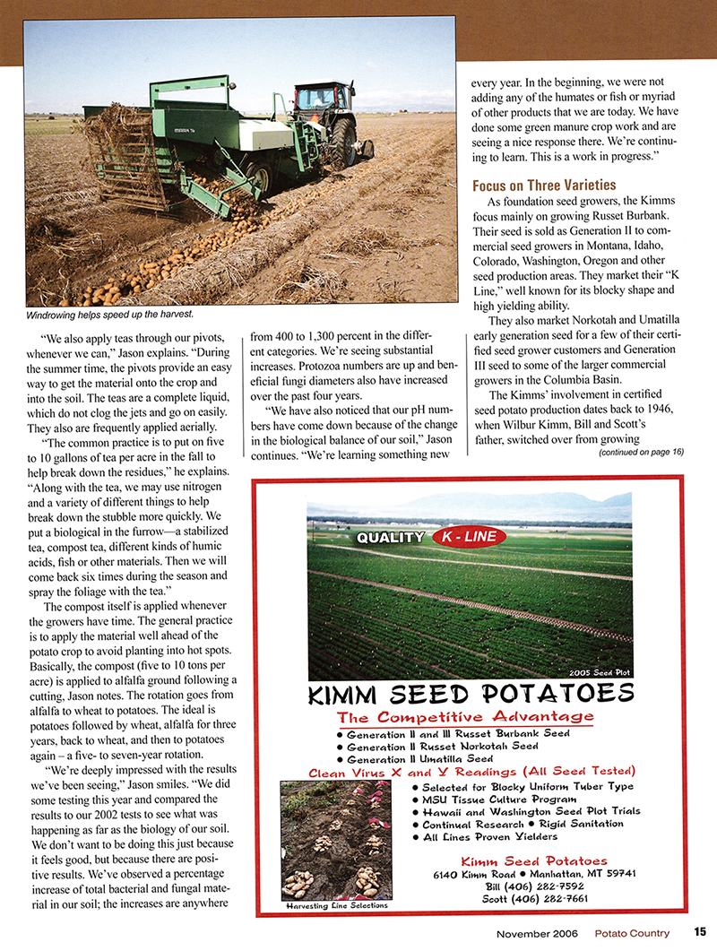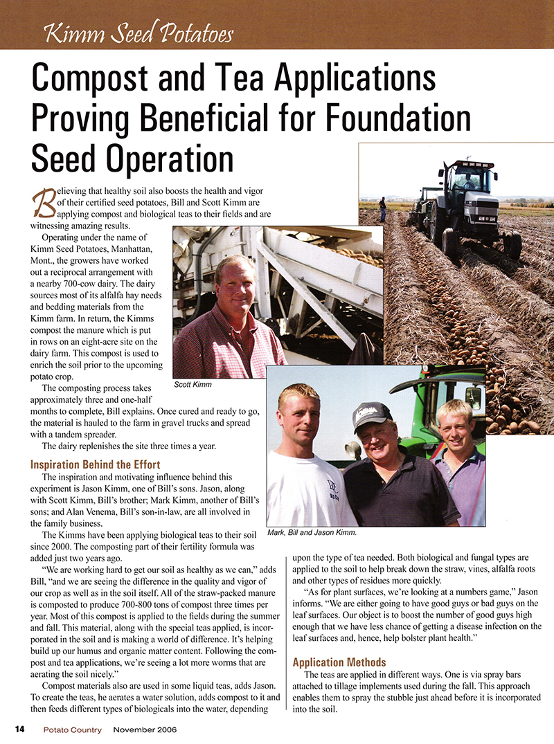 Here in the states, we had several members of Kimm Seed Farm on the cover of Potato Country. The Kimms talked about their use of compost and tea applications which improved their soil quality and had a positive effect on the strength and quality of their tubers.