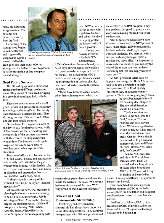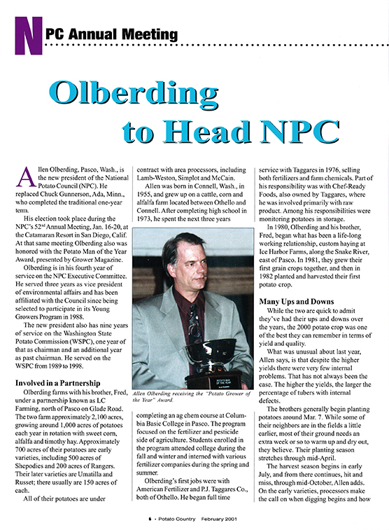 In February 2001, we had Allen and Fred Olberding on the cover of Potato Country magazine. Allen had just been named the new head of the NPC.