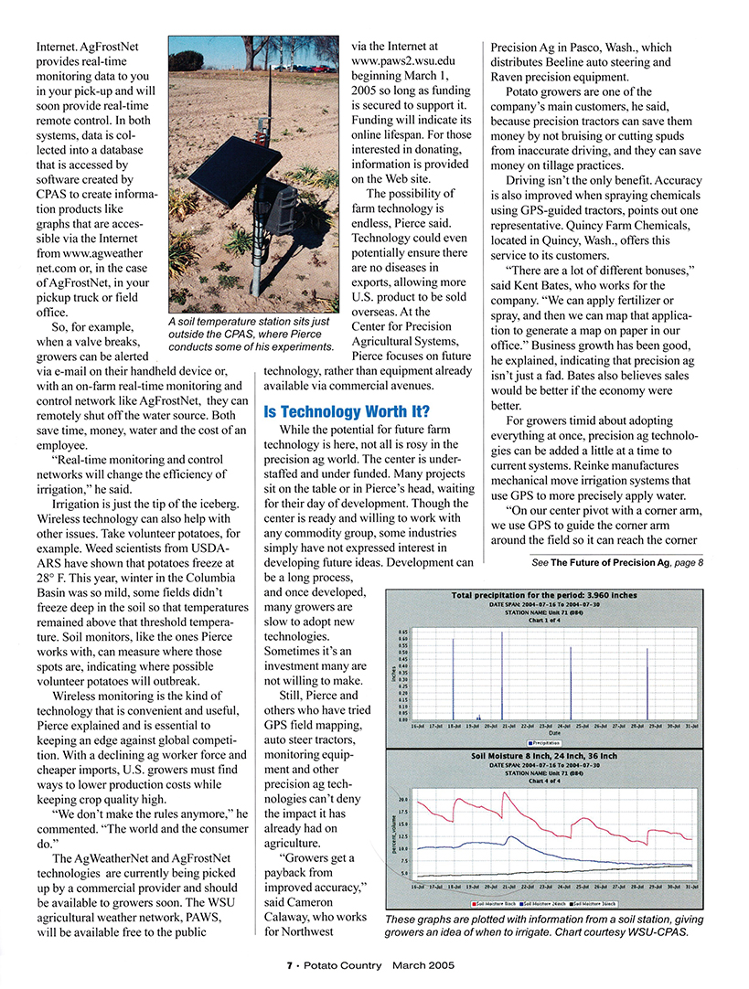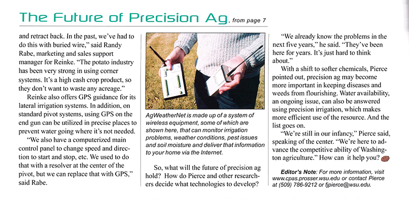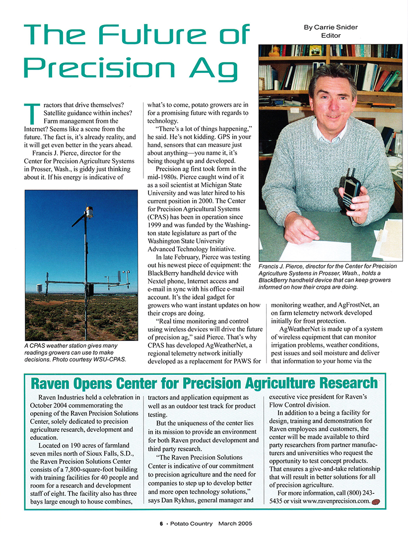 Precision Agriculture has been a hot topic for years. Back in March of 2005, Potato Country had Francis J. Pierce on the cover to talk about the latest developments. At the time he was the director of the Center for Precision Agricultural Systems, part of the Washington State University Advanced Technology Initiative.