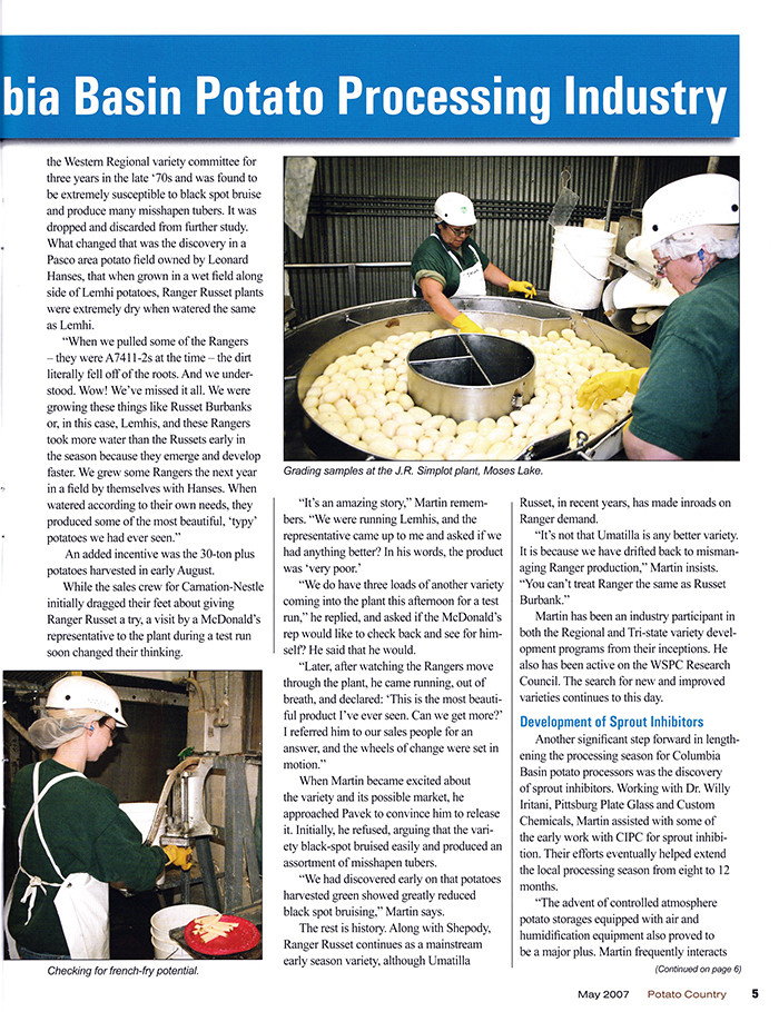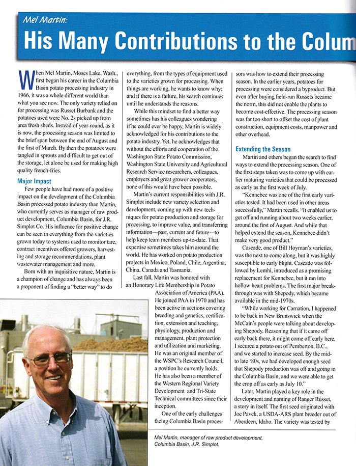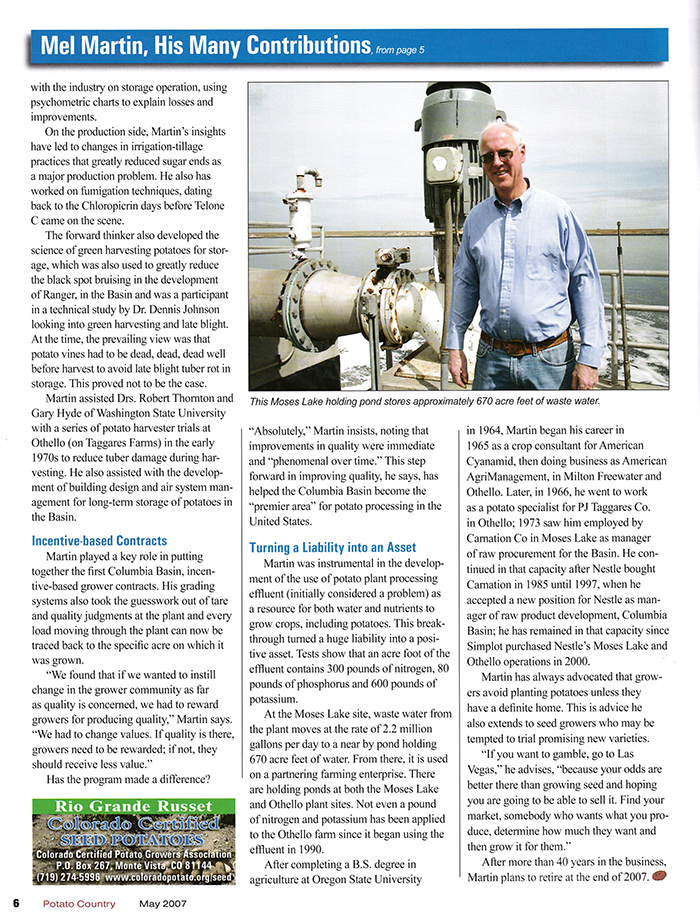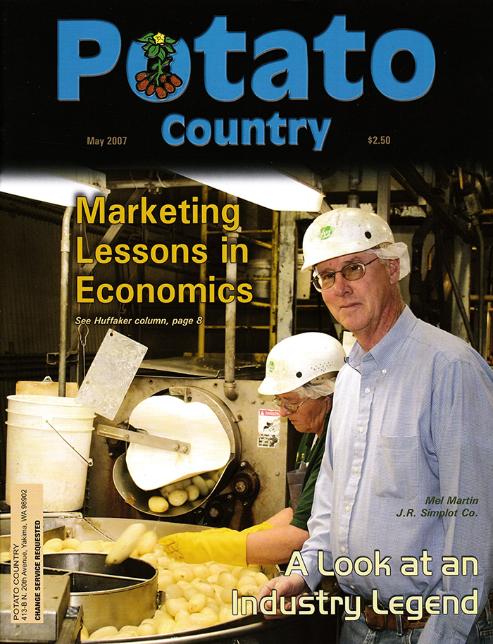 In the May 2007 issue, Potato Country had Mel Martin on the cover. The feature was a look at an industry legend, just as the title stated. Martin was influential in various aspects of the potato industry. Some of his accomplishments include new varieties, sprout inhibitors, incentive-based contracts, and recycling nutrient-rich waste water.