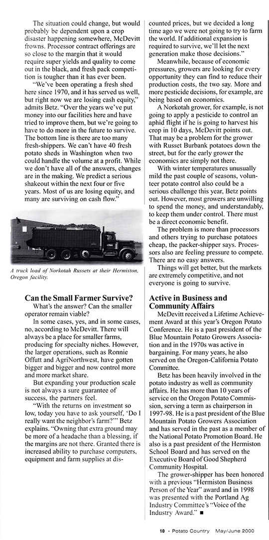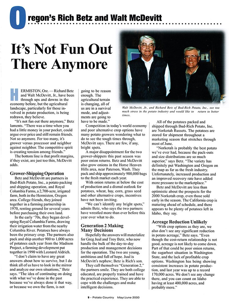In the May/June 2000 issue, we had Rich Betz and Walt McDevitt on the cover. They were featured in a story titled “It’s Not Fun Out There Anymore.” In the piece, they lament the changes they have seen in the potato industry. The two ran Bud-Rich Potato, Inc., a potato packing and shipping operation, as well as a 2,700-acre irrigated farm.