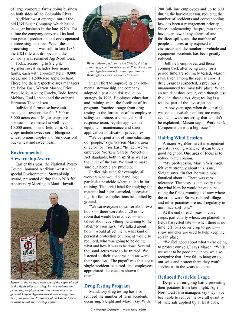 In the May/June 1999 issue, we had Warren Mason (left) and Don Sleight on the cover. The were featured talking about taking their environmental stewardship responsibilities seriously. In fact, the National Potato Council even gave them an award for it.