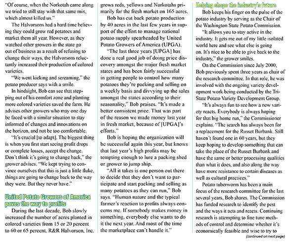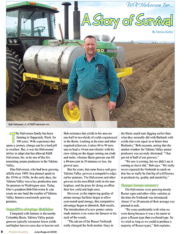 In the July/August 2009 issue, we had Bob Halvorson Jr. of R&R Halvorson Inc. on the cover of Potato Country magazine. He is photographed here in his field in Toppenish, Washington.