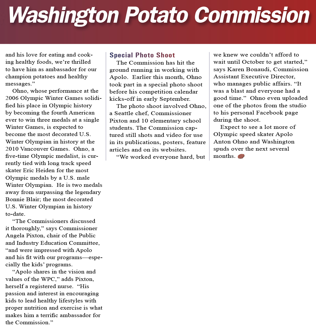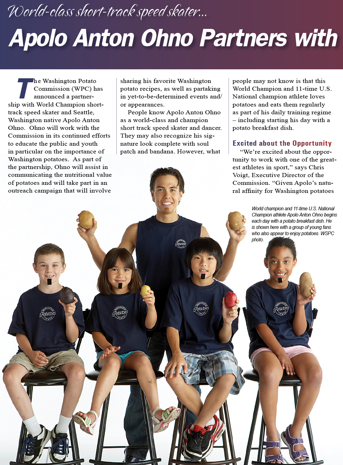 In 2009, the Washington Potato Commission partnered with Ohno to communicate the nutritional value of potatoes.