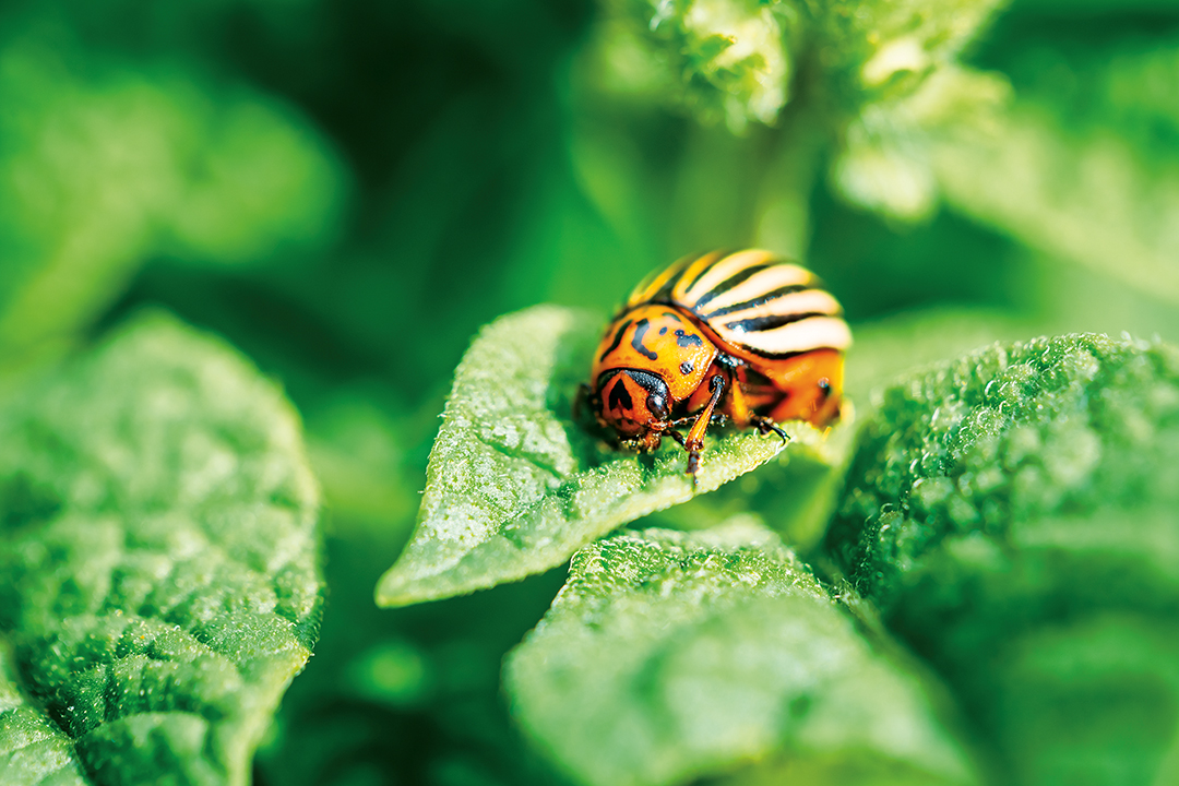 This tiny, yet distinctive, pest – with adults having a bright yellow-orange body and five bold, brown stripes along the length of each of its elytra – is considered among the most devastating insect defoliators of potatoes. Its larvae, identified by their large nine-segment abdomen and orange-pink color, may also defoliate potato plants, resulting in yield losses up to 100 percent if the damage occurs prior to tuber formation.