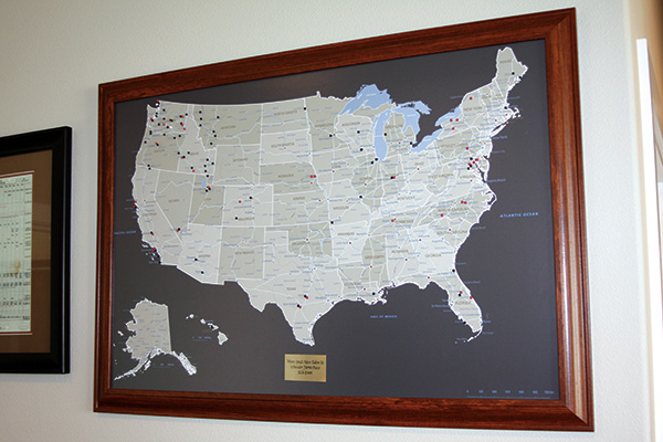 Grant Morris and Ed Schneider, partners in Schneider Farms, pin their potato-related travels on this map in their office.