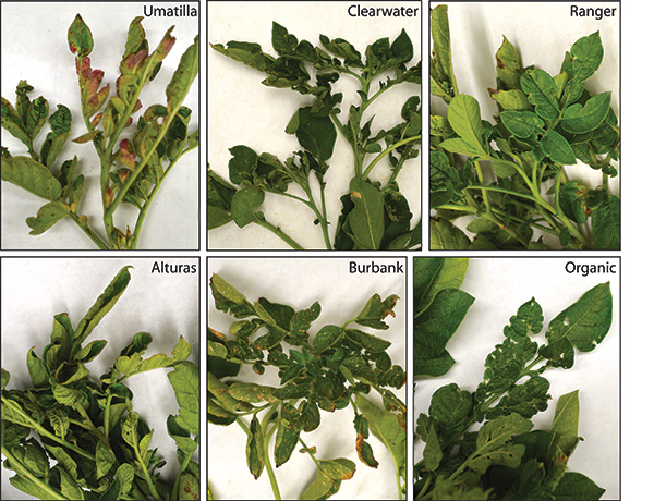 Differences in symptom timing and development across cultivars were readily apparent throughout the Columbia Basin. Umatilla Russet consistently showed the most severe symptoms, with leaf distortion, terminal leaf purpling and stem lesions evident across entire fields by mid-August. At this same time, foliage of Clearwater Russet generally looked healthy, though leaf distortion and the initiation of leaf purpling was visible across all observed fields. Clear leaf distortion and stem lesions were observed in the Alturas and Ranger Russet cultivars in late July and mid-August, respectively, but very little purpling was seen. Foliage of the Russet Burbank cultivar was surprising, showing only very low levels of leaf distortion and stem lesions in mid-August.