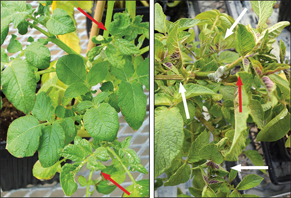 Symptomatic tissue was grafted to healthy potato plants in the greenhouse at the USDA-Agricultural Research Service in Prosser, Wash. Most grafted plants did not show transmission of a pathogen (left), though plants grafted with beet leafhopper-transmitted virescence agent phytoplasma-infected tissue did (right). Red arrows indicate the grafted field tissue (scions); white arrows indicate development of purple top symptoms on the healthy recipient plant.