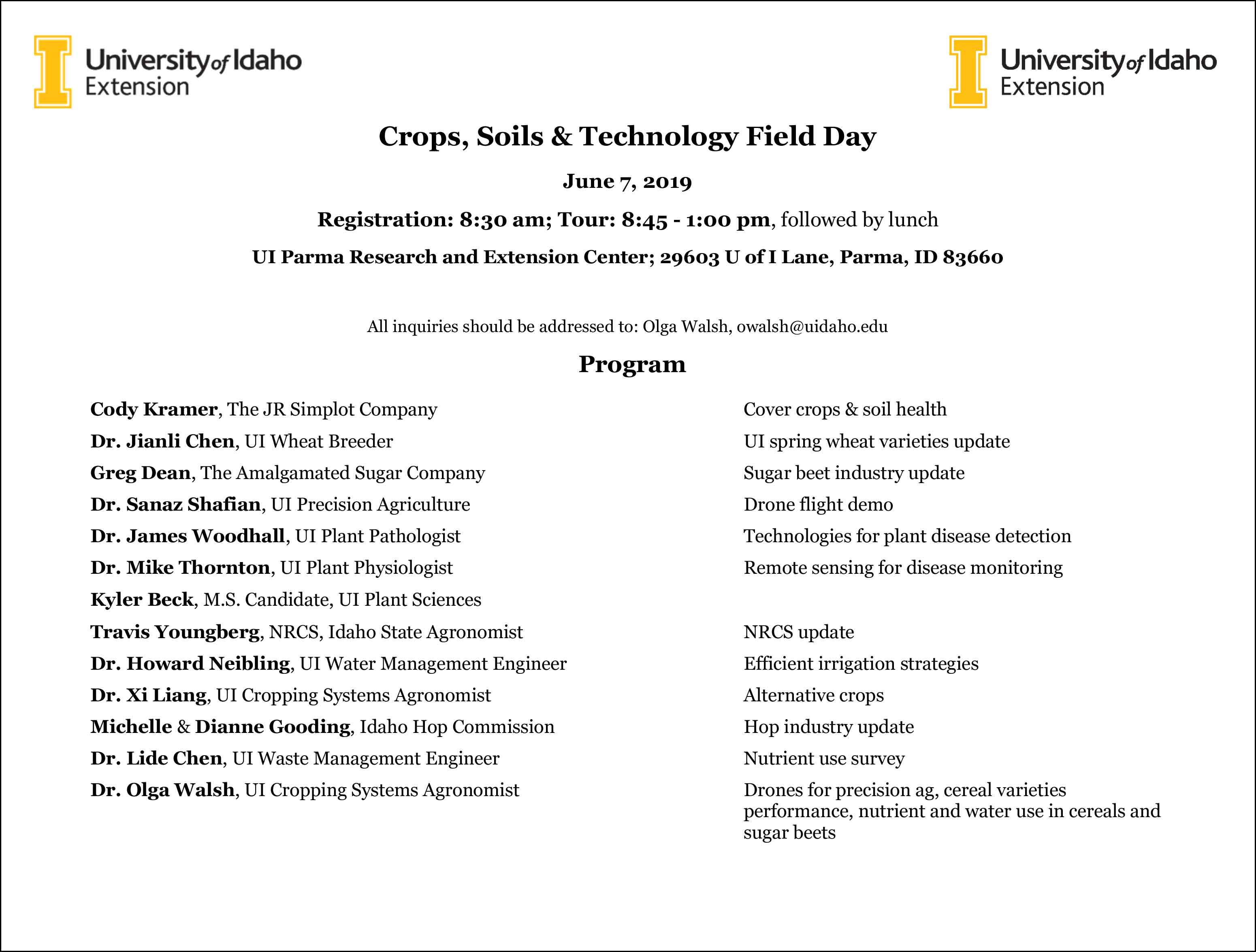 The University of Idaho Crops, Soils and Technology Field Day at the UI Parma Research and Extension Center is June 7, 2019; 8:45 to 1:00 pm, followed by lunch.
