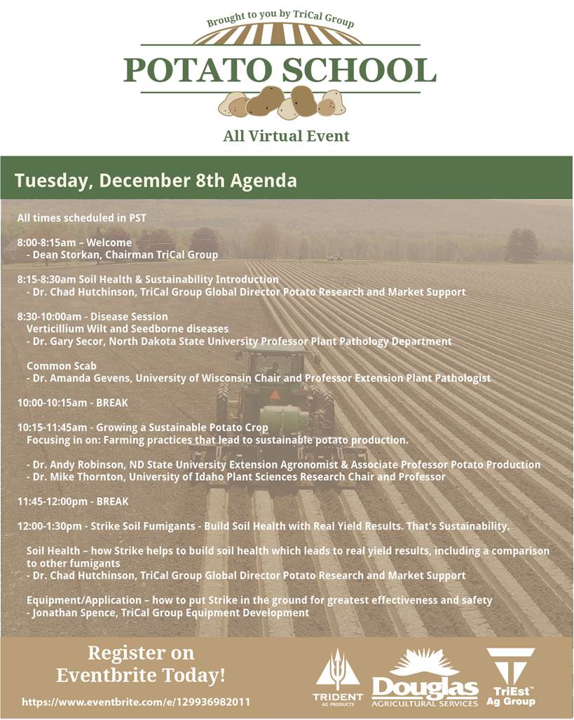 Tri-Cal Group is presenting Potato School 2020 virtually on Tuesday, December 8th at 8 a.m. – 2 p.m. PST.