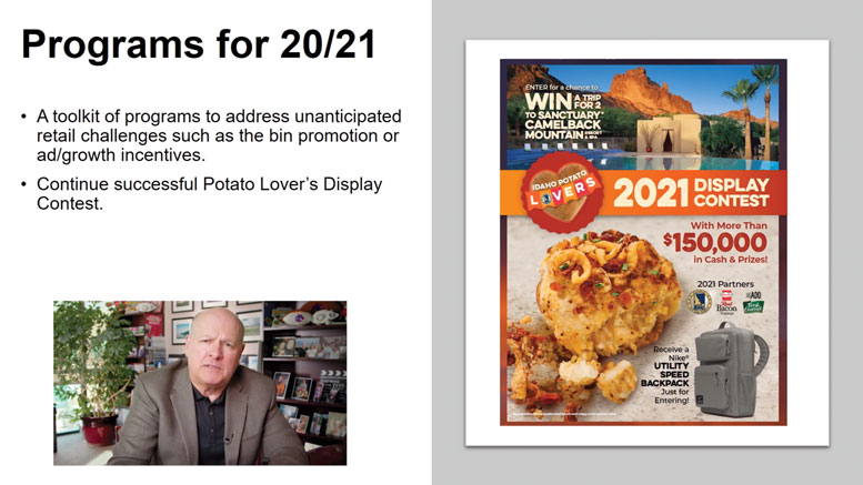 He went on to explain how the IPC pivoted to adjust its programs in response to those challenges. To start, the IPC helped redirect foodservice cartons to retail shelves, ultimately moving 37 million pounds of potatoes from foodservice to retail. The commission also worked with operators in the foodservice industry to shift business to a delivery or takeout mode and continued to supply economic and easy-to-prepare potato recipes.