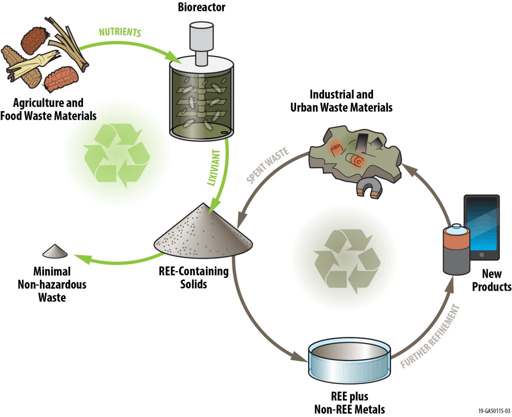 This diagram shows how the bioleaching process— an environmentally friendly way to recycle rare earth elements—can reduce two waste streams: potato wastewater and used electronic devices.