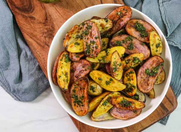 A simply divine side dish that pairs beautifully with just about any meats or veggies, Roasted Fingerling Potatoes with Gremolata are made with a few wholesome ingredients, making this a great weeknight dinner staple. Sliced Idaho® fingerling potatoes are baked in the oven until fork-tender then set aside. Chopped parsley, garlic, lemon zest and juice, olive oil, salt, pepper and poultry blend seasoning are pulsed together in a food processor to create the gremolata. Drizzle this aromatic sauce over the potatoes and serve warm.
