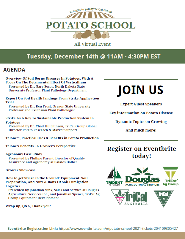 TriCal Group will be putting on another free virtual potato school next week on Tuesday, December 14th from 11 a.m. to 4:30 p.m. ET.