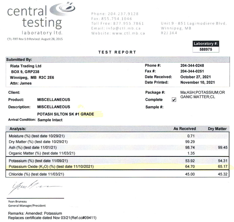 Riata Trading LTD. has salvaged potash (K2O – Potassium Chloride) available from a rail car spill at a discount.