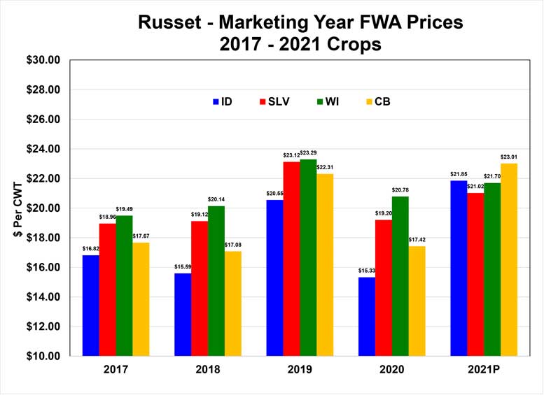 Figure 1 shows the marketing year fresh weighted average prices (FWA) for russet table potatoes in Idaho, the San Luis Valley, Wisconsin and the Columbia Basin over the past five years. The 2021 prices are preliminary through March 16, 2022 (press time). There are several interesting things to point out with prices for the 2021 crop.