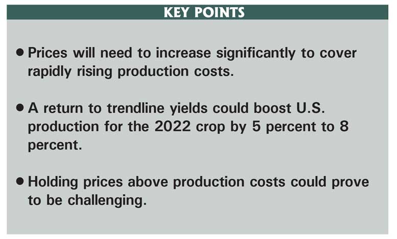 Prices for fuel, fertilizer, chemicals and repairs have surged. Labor supplies are short, and growers have had to increase wages to keep employees. In addition, rising interest rates will contribute to the overall increases in costs. If 2022 crop yields return to trendline, that could increase total production costs by $0.60 to $2 per cwt. Break-even prices to the grower will take another big jump in 2022.