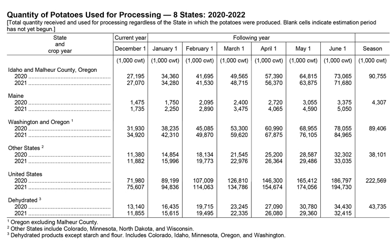 Processors in Idaho and Malheur County, Oregon used 71.7 million cwt. of potatoes for the season, down 2 percent from June l, 2021. In Washington and other Oregon counties, 85.0 million cwt of potatoes had been used by processors for the season, up 9 percent from the previous year. Processors in the 8 States used 195 million cwt of potatoes for the season, up 4 percent from June 2021.