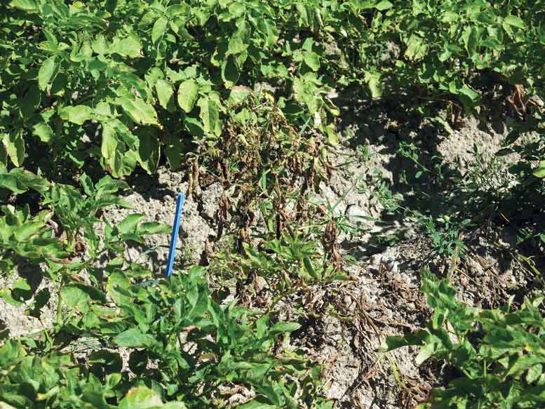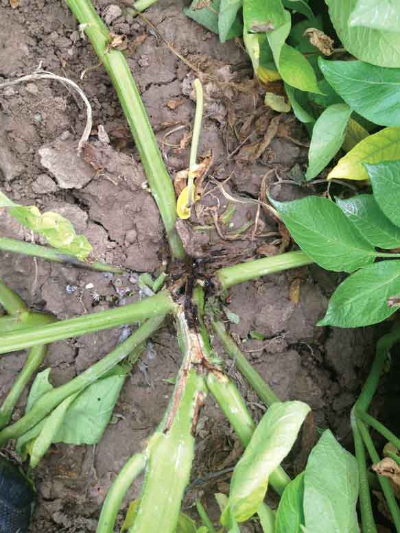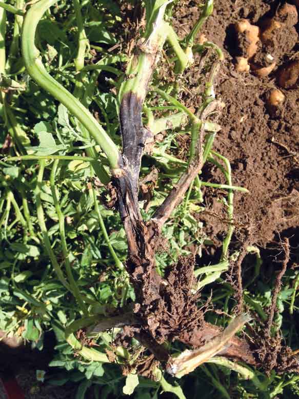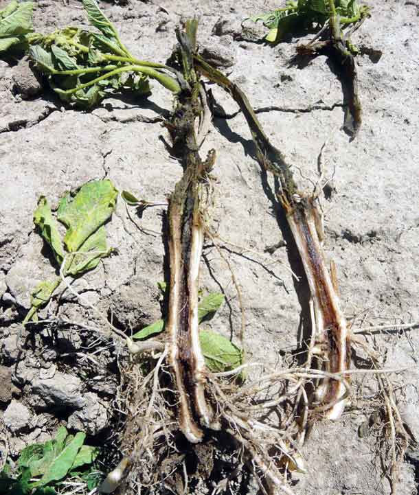 During emergence, all your potato plants appeared normal. You didn’t observe any blackleg at that time. As the season progresses and the temperatures increase, however, you begin to notice wilted plants scattered throughout the field (Photo 1). When you look at the base of these plants, you see the stem is dark brown to black near the soil line (Photo 2). When you pull the plant from the ground, the lower stem is black and decayed (Photo 3), but not as slimy as you would expect with typical blackleg. The inside of the stem is hollowed out (Photo 4). What is causing this problem?
