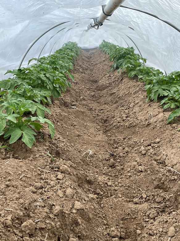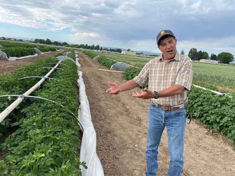 Mike Thornton, a University of Idaho plant sciences professor at the Parma Research and Extension Center, shows off the rows of potatoes in his experiment to simulate the effects of wildfire smoke on potato varieties. When the plastic covers are up, smoke is trapped to saturate potato plants. By U of I’s College of Agricultural and Life Sciences.