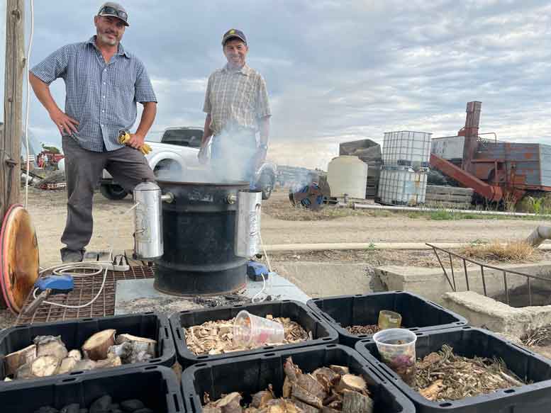 Deron Beck, a scientific aide at the UI Parma Research and Extension Center, left, and Mike Thornton, a U of I plant sciences professor in Parma, stand by the smoker they use to simulate wildfire smoke and its effects on potatoes, as well as trays filled with different types of wood to make the most accurate wildfire smoke simulation possible. Their wildfire smoke project will be starting its second growing season. By U of I’s College of Agricultural and Life Sciences.