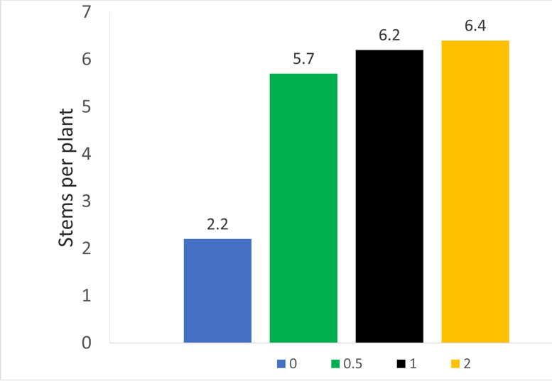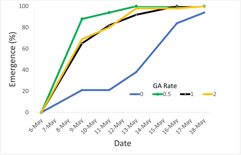 One way to manipulate size distribution to get more yield in the most valuable categories is to adjust stem number by application of plant growth regulators. For the past three years, we have been studying the response of the red potato variety Chieftain to two commercially available plant growth regulators that were applied to seed. ProGibb 4% (a gibberellin) is labeled to break dormancy and promote uniform emergence, while Rejuvenate Seed Treatment (an auxin) helps restore apical dominance in aged seed and control stem number. We applied the ProGibb 4% at rates of 0 (water check), 0.5, 1 and 2 ml per ton of seed alone or in combination with 4 ml (0.13 fluid oz) of Rejuvenate. The applications were made in a total spray volume of 0.5 gallons per ton immediately after the seed was cut.