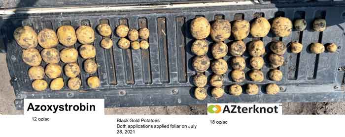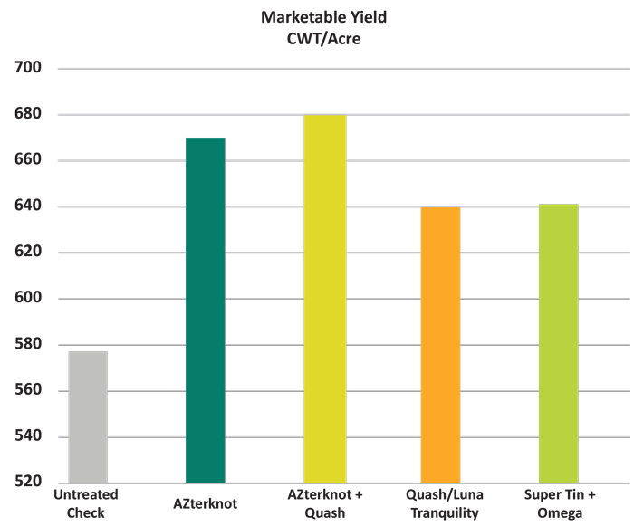A potato fungicide trial completed by Miller Research in 2022 tested 14 products including a biological fungicide treatment that was half Azoxystrobin and half Reynoutria extract, a biological. The results speak for themselves (Fig. 1). By combining the ease of use with a dual mode of action fungicide, the product called AZterknot provided consistent disease control and had the highest marketable yield in the study. While AZterknot is only a half biological product, it shows the potential for biological products to fit in large-scale operations without sacrificing efficacy or yield to reduce AI load (Fig. 2). And this is just one biological product on the market out of hundreds.