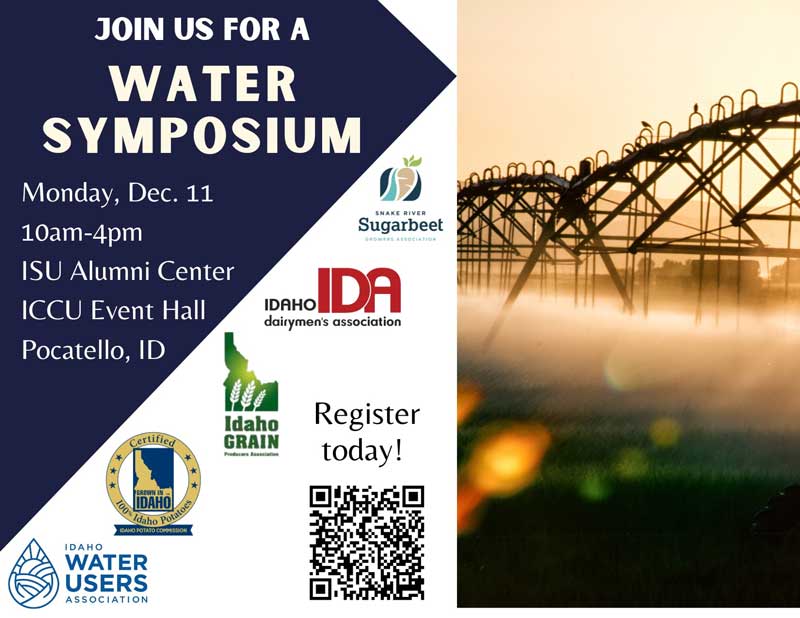 The inaugural Idaho Agriculture Water Symposium is set for Pocatello, Idaho on Monday, December 11 from 10 a.m. to 4 p.m. at the Idaho State Alumni Center in the ICCU Event Hall.