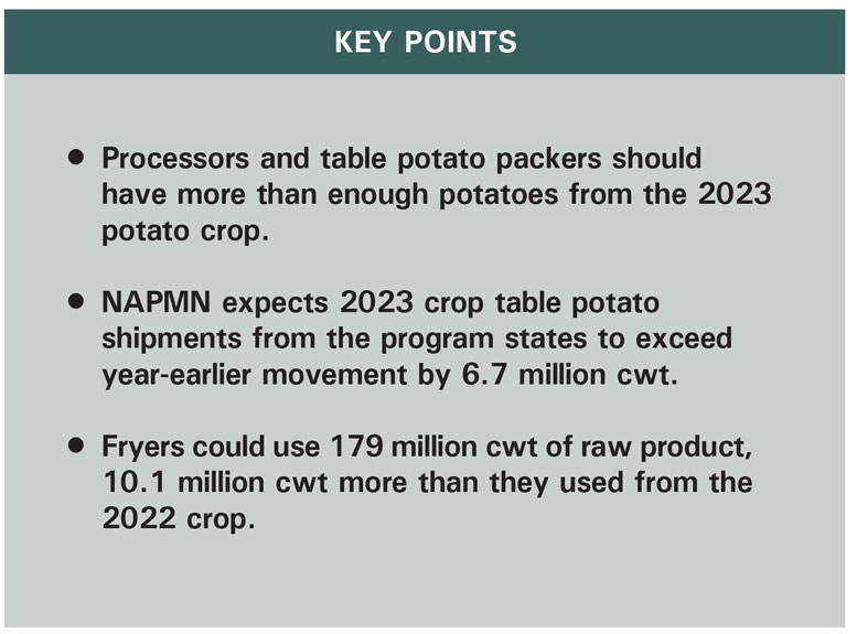 At 431.8 million cwt, U.S. potato production, in the reporting states, is expected to exceed the 2022 crop by 33.1 million cwt. (That is according to North American Potato Market News’ (NAPMN) estimate as of press time). A large portion of the 8.3 percent increase was intended for the frozen processing industry, but the expansion has already impacted the table potato and dehydrated product sectors.