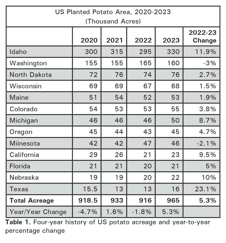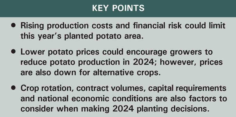 Several other factors could affect the 2024 U.S. potato acreage. Processing contract volumes in the Pacific Northwest are expected to be down, following last year’s large production increase. Carryover from the 2023 crop will reduce the need for early potatoes. Contract volumes may be more stable in the Midwest and Northeastern processing states. On the bright side, both domestic and export demand for French fries and other frozen products has been strong. Crop rotation requirements typically prevent wide year-to-year swings in potato acreage. Shifts in acreage on a statewide basis are often more variable than the change in acreage on a national level. Year-to-year changes are typically less than 5 percent. Finally, the country’s overall economic and political conditions may also weigh heavily on planting decisions. Growers across the country are considering the unique financial, production and market risks of growing potatoes this year.
