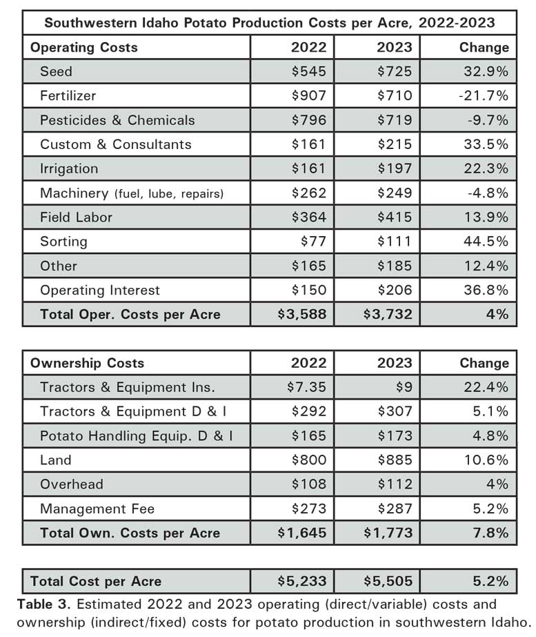 Though prices for some inputs could come down this year, overall production costs are expected to remain high for the 2024 crop. Table 3 shows the estimated 2022 and 2023 operating (direct/variable) costs and ownership (indirect/fixed) costs for potato production in southwestern Idaho. Per acre operating costs rose by 4 percent. There were significant cost increases last year for seed, custom and consultants, irrigation and labor. On the other hand, fertilizer, chemical and fuel prices were down from 2022 levels. Currently, seed, fuel, chemical and fertilizer costs are below year-earlier levels. Other operating expenses are expected to increase in 2024. Labor costs are likely to continue upward with rising inflation. Relatively high interest rates could decline somewhat, but probably not before operating loans are secured.