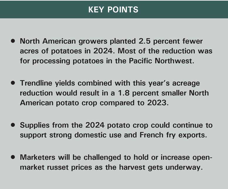Below break-even open-market prices have encouraged growers in the Pacific Northwest and other areas to cut back on russet potato production. However, if USDA’s planted area estimates are correct, russet table potato supplies could be abundant during the 2024-25 marketing year. Growers in the Pacific Northwest planted 18,000 fewer acres of potatoes than they did last year. Trendline yields would result in a 2.8 percent reduction in Pacific Northwest potato production. Idaho’s 5,000-acre reduction combined with a trend yield would boost that state’s total production to 145.1 million cwt, slightly larger than the 2023 crop. Canadian growers did not cut back significantly on russet table potato acreage in 2024. Canada’s russet table potato production could increase if yields rebound in Prince Edward Island, New Brunswick and Quebec. Marketers will be challenged to hold and/or increase prices during August and September as the harvest gets underway.