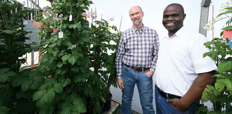 Rich Novy, USDA-ARS research geneticist, and Kenyan potato researcher John Onditi stand next to a pair of Unica potato plants from Kenya being used to cross-pollinate with other potato varieties and potentially create a new potato variety.