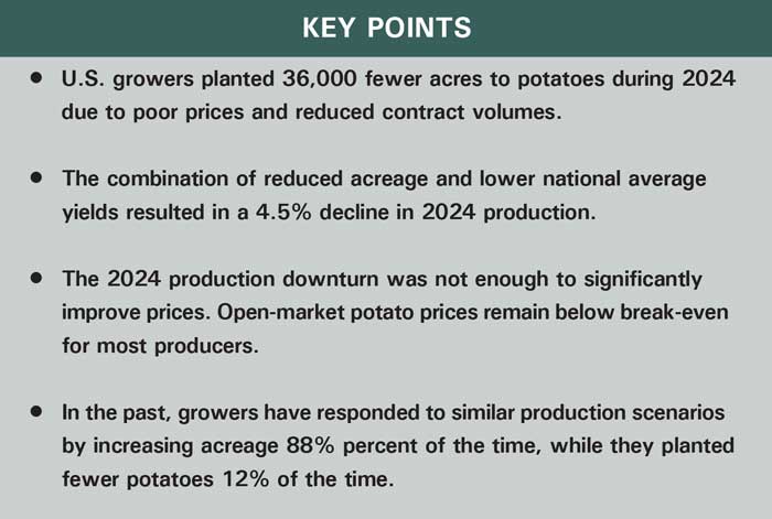 Growers have several things to consider when making planting decisions on 2025 potato acreage. Factors include contract volumes, current and projected prices, production costs, prices for alternative crops, crop rotations, trade disruptions and irrigation water supplies.