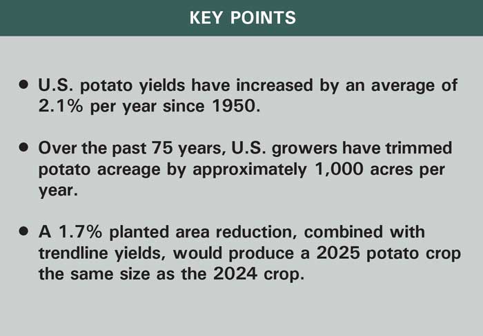 The productivity gains in U.S. potato production have been impressive during the past 75 years, though there have been significant year-over-year swings in the U.S. planted area, national average yields and total production. Making projections for the 2025 potato crop has been particularly challenging due to large contract volume reductions, current market conditions, demand uncertainty, poor alternative crop prices and several other factors. In this article, we take a close look at historical U.S. potato yields, acreage and production to gain a long-term perspective on where production could be for the 2025 potato crop.