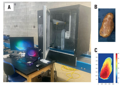 These principles have guided the USDA-ARS Potato Genetics Lab in Prosser, Washington, to develop an AI-powered potato tuber evaluation workflow that can be used to leverage predictive breeding in potato. Collins Wakholi, a postdoctoral research associate in Devin Rippner’s USDA-ARS soil science laboratory, constructed an AI-based data collection platform from consumer-grade hardware components including a belt-conveyor, image staging box with uniform lighting, RGB-D camera and GPU-enabled computer (Fig. 1A). This imaging system captures both a color image and depth map at a rate of 15 images per second while the GPU-enabled computer is using an AI model to detect and track the individual tubers across the imaging plane, saving a single cropped image and depth map of each tuber (Fig. 1B, Fig. 1C).