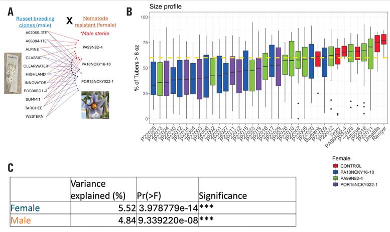 Genetic improvement of potato through traditional breeding is challenging due to tetraploid genetics, slow rate of increase through clonal propagation and the stringent requirements of the consumer. Historically, potato breeding programs have heavily relied on brute force phenotypic selection to identify the highest performing clones from an initial breeding population of 50,000 – 100,000 individuals over an eight- to 10-year period. Initial evaluations are purely visual in nature and generally last less than a minute. Data on yield components, solids content, tuber shape, fry quality and defect susceptibility can generally be collected as early as the second field year with increased replication and additional field sites incorporated in later years. Although this process efficiently removes poor performing clones from the breeding pipeline, our inability to comprehensively and quantitatively evaluate many of the characteristics that influence cultivar adoption at early stages in this process limit application of the quantitative genetics methods that enable predictive breeding.