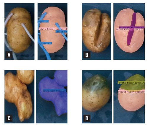 Another benefit of this approach is that data already collected for one purpose may be reused to train models that enable us to measure new features. USDA/Cornell Breeding Insight scientists Bhoja Basnet and Tyr Wiesner-Hanks utilized the partially annotated data collected from these studies to construct new models that can detect tuber defects including sprouting, growth cracks, secondary growth and greening with acceptable accuracy (Fig. 3). Breeding Insight is funded by the USDA, housed at Cornell University and levels the crop-improvement playing field by supporting USDA-ARS specialty crop breeders as they adopt data-driven tools and cutting-edge technologies in their day-to-day work. These models can be applied to new and existing data to glean additional insights and discover genetic variants linked with susceptibility to these defects.