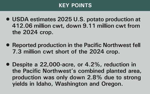 USDA put Washington’s average yield at 635 cwt per acre, 15 cwt per acre above the 2024-crop yield. It is the state’s largest yield since 2020. It is 21 cwt per acre above the five-year average. USDA also put Oregon’s average yield at 635 cwt per acre, up from 610 cwt for the 2024 crop. The combined changes result in a 114.62 million cwt potato crop in 2025. That is 10.44 million cwt less than the region produced in 2024, an 8.3% reduction.