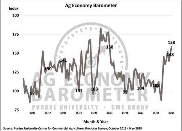 Farmer sentiment improved for the second consecutive month in May, reaching its highest level since May 2021. The Purdue University/CME Group Ag Economy Barometer rose 10 points to a reading of 158,…